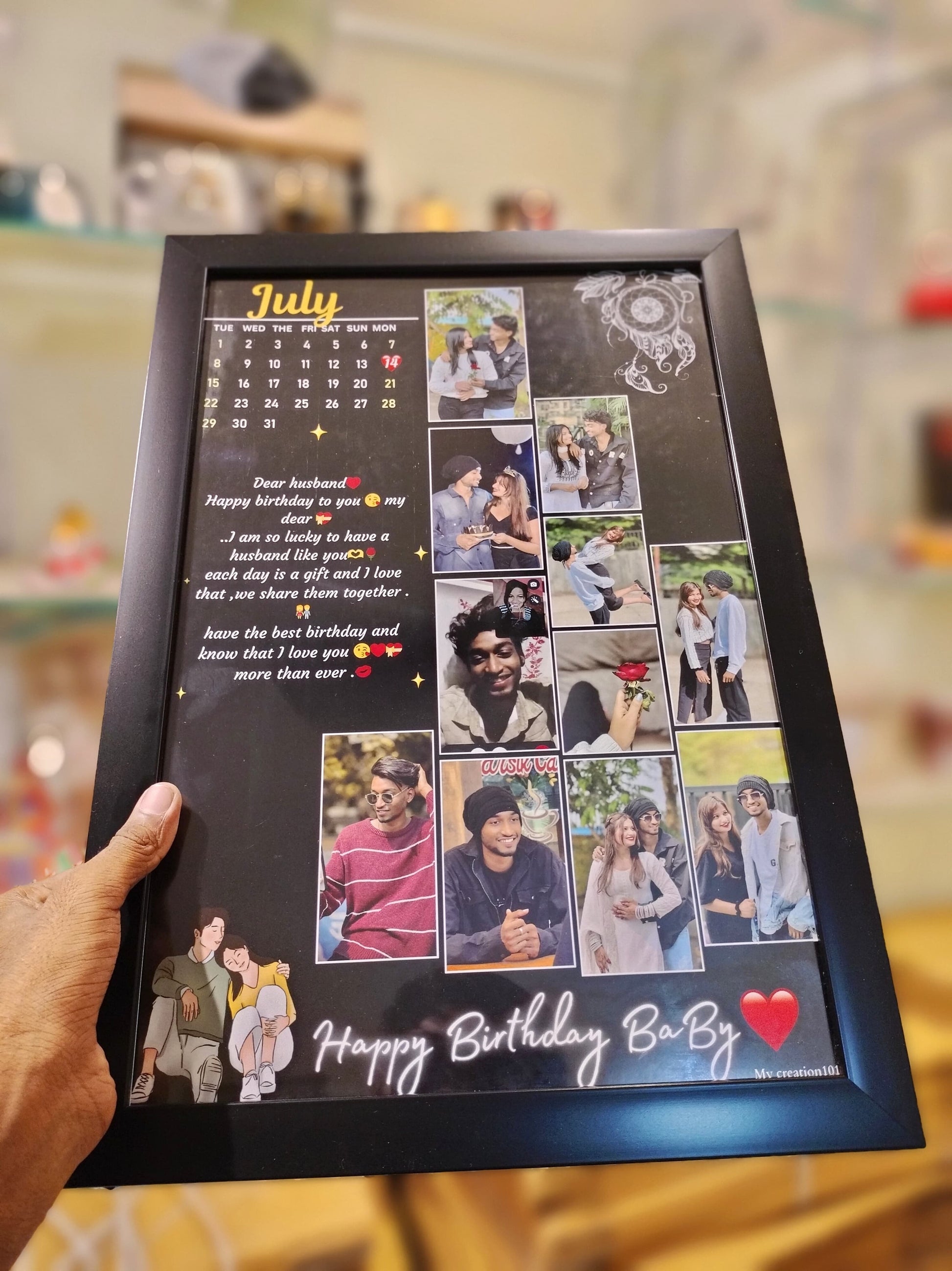 Create a unique and heartfelt gift with a personalized photo frame featuring 12 photos, a custom caption, calendar date, and name. Perfect for birthdays, anniversaries, or any special occasion!